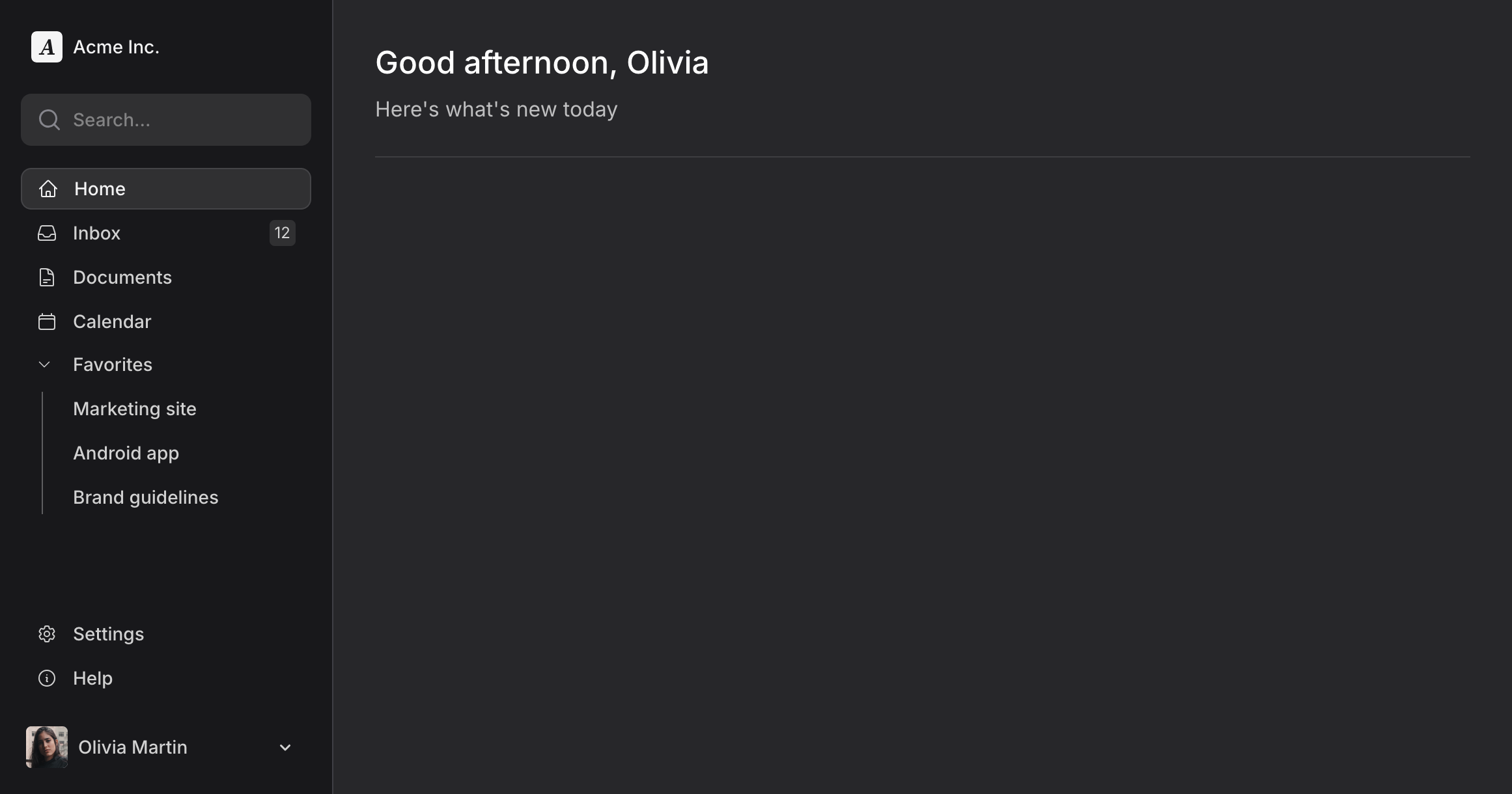 <head> <!-- ... --> @fluxAppearance</head><body class="min-h-screen bg-white dark:bg-zinc-800 antialiased"> <flux:sidebar sticky collapsible class="bg-zinc-50 dark:bg-zinc-900 border-r border-zinc-200 dark:border-zinc-700"> <flux:sidebar.header> <flux:sidebar.brand href="#" logo="https://fluxui.dev/img/demo/logo.png" logo:dark="https://fluxui.dev/img/demo/dark-mode-logo.png" name="Acme Inc." /> <flux:sidebar.collapse class="in-data-flux-sidebar-on-desktop:not-in-data-flux-sidebar-collapsed-desktop:-mr-2" /> </flux:sidebar.header> <flux:sidebar.nav> <flux:sidebar.item icon="home" href="#" current>Home</flux:sidebar.item> <flux:sidebar.item icon="inbox" badge="12" href="#">Inbox</flux:sidebar.item> <flux:sidebar.item icon="document-text" href="#">Documents</flux:sidebar.item> <flux:sidebar.item icon="calendar" href="#">Calendar</flux:sidebar.item> <flux:sidebar.group expandable icon="star" heading="Favorites" class="grid"> <flux:sidebar.item href="#">Marketing site</flux:sidebar.item> <flux:sidebar.item href="#">Android app</flux:sidebar.item> <flux:sidebar.item href="#">Brand guidelines</flux:sidebar.item> </flux:sidebar.group> </flux:sidebar.nav> <flux:sidebar.spacer /> <flux:sidebar.nav> <flux:sidebar.item icon="cog-6-tooth" href="#">Settings</flux:sidebar.item> <flux:sidebar.item icon="information-circle" href="#">Help</flux:sidebar.item> </flux:sidebar.nav> <flux:dropdown position="top" align="start" class="max-lg:hidden"> <flux:sidebar.profile avatar="https://fluxui.dev/img/demo/user.png" name="Olivia Martin" /> <flux:menu> <flux:menu.radio.group> <flux:menu.radio checked>Olivia Martin</flux:menu.radio> <flux:menu.radio>Truly Delta</flux:menu.radio> </flux:menu.radio.group> <flux:menu.separator /> <flux:menu.item icon="arrow-right-start-on-rectangle">Logout</flux:menu.item> </flux:menu> </flux:dropdown> </flux:sidebar> <flux:header class="lg:hidden"> <flux:sidebar.toggle class="lg:hidden" icon="bars-2" inset="left" /> <flux:spacer /> <flux:dropdown position="top" align="start"> <flux:profile avatar="/img/demo/user.png" /> <flux:menu> <flux:menu.radio.group> <flux:menu.radio checked>Olivia Martin</flux:menu.radio> <flux:menu.radio>Truly Delta</flux:menu.radio> </flux:menu.radio.group> <flux:menu.separator /> <flux:menu.item icon="arrow-right-start-on-rectangle">Logout</flux:menu.item> </flux:menu> </flux:dropdown> </flux:header> <flux:main> <flux:heading size="xl" level="1">Good afternoon, Olivia</flux:heading> <flux:text class="mt-2 mb-6 text-base">Here's what's new today</flux:text> <flux:separator variant="subtle" /> </flux:main> @fluxScripts</body>