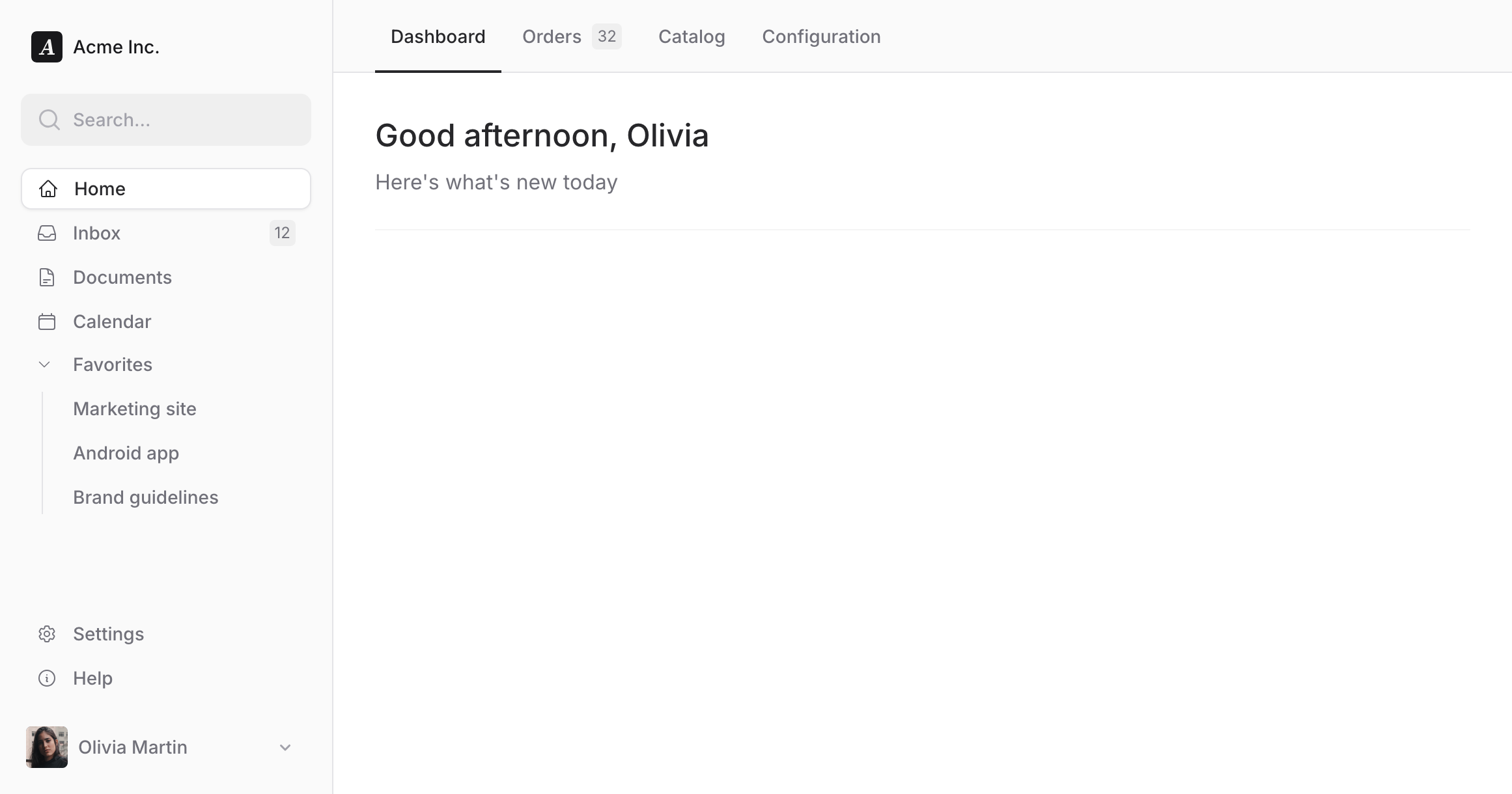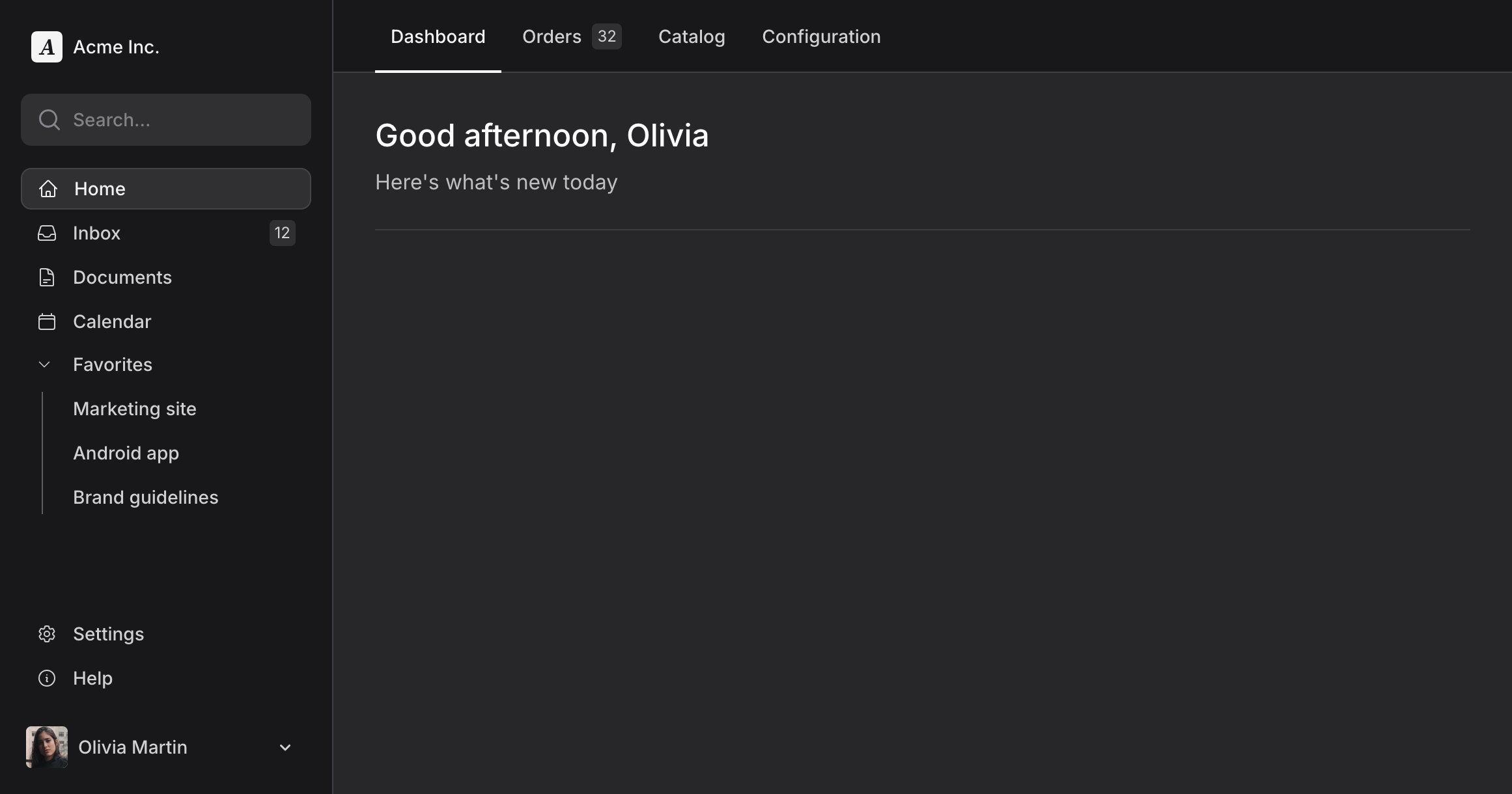 <head> <!-- ... --> @fluxAppearance</head><body class="min-h-screen bg-white dark:bg-zinc-800 antialiased"> <flux:sidebar sticky collapsible="mobile" class="bg-zinc-50 dark:bg-zinc-900 border-r border-zinc-200 dark:border-zinc-700"> <flux:sidebar.header> <flux:sidebar.brand href="#" logo="https://fluxui.dev/img/demo/logo.png" logo:dark="https://fluxui.dev/img/demo/dark-mode-logo.png" name="Acme Inc." /> <flux:sidebar.collapse class="lg:hidden" /> </flux:sidebar.header> <flux:sidebar.search placeholder="Search..." /> <flux:sidebar.nav> <flux:sidebar.item icon="home" href="#" current>Home</flux:sidebar.item> <flux:sidebar.item icon="inbox" badge="12" href="#">Inbox</flux:sidebar.item> <flux:sidebar.item icon="document-text" href="#">Documents</flux:sidebar.item> <flux:sidebar.item icon="calendar" href="#">Calendar</flux:sidebar.item> <flux:sidebar.group expandable heading="Favorites" class="grid"> <flux:sidebar.item href="#">Marketing site</flux:sidebar.item> <flux:sidebar.item href="#">Android app</flux:sidebar.item> <flux:sidebar.item href="#">Brand guidelines</flux:sidebar.item> </flux:sidebar.group> </flux:sidebar.nav> <flux:sidebar.spacer /> <flux:sidebar.nav> <flux:sidebar.item icon="cog-6-tooth" href="#">Settings</flux:sidebar.item> <flux:sidebar.item icon="information-circle" href="#">Help</flux:sidebar.item> </flux:sidebar.nav> <flux:dropdown position="top" align="start" class="max-lg:hidden"> <flux:sidebar.profile avatar="https://fluxui.dev/img/demo/user.png" name="Olivia Martin" /> <flux:menu> <flux:menu.radio.group> <flux:menu.radio checked>Olivia Martin</flux:menu.radio> <flux:menu.radio>Truly Delta</flux:menu.radio> </flux:menu.radio.group> <flux:menu.separator /> <flux:menu.item icon="arrow-right-start-on-rectangle">Logout</flux:menu.item> </flux:menu> </flux:dropdown> </flux:sidebar> <flux:header class="block! bg-white lg:bg-zinc-50 dark:bg-zinc-900 border-b border-zinc-200 dark:border-zinc-700"> <flux:navbar class="lg:hidden w-full"> <flux:sidebar.toggle class="lg:hidden" icon="bars-2" inset="left" /> <flux:spacer /> <flux:dropdown position="top" align="start"> <flux:profile avatar="https://fluxui.dev/img/demo/user.png" /> <flux:menu> <flux:menu.radio.group> <flux:menu.radio checked>Olivia Martin</flux:menu.radio> <flux:menu.radio>Truly Delta</flux:menu.radio> </flux:menu.radio.group> <flux:menu.separator /> <flux:menu.item icon="arrow-right-start-on-rectangle">Logout</flux:menu.item> </flux:menu> </flux:dropdown> </flux:navbar> <flux:navbar scrollable> <flux:navbar.item href="#" current>Dashboard</flux:navbar.item> <flux:navbar.item badge="32" href="#">Orders</flux:navbar.item> <flux:navbar.item href="#">Catalog</flux:navbar.item> <flux:navbar.item href="#">Configuration</flux:navbar.item> </flux:navbar> </flux:header> <flux:main> <flux:heading size="xl" level="1">Good afternoon, Olivia</flux:heading> <flux:text class="mb-6 mt-2 text-base">Here's what's new today</flux:text> <flux:separator variant="subtle" /> </flux:main> @fluxScripts</body>